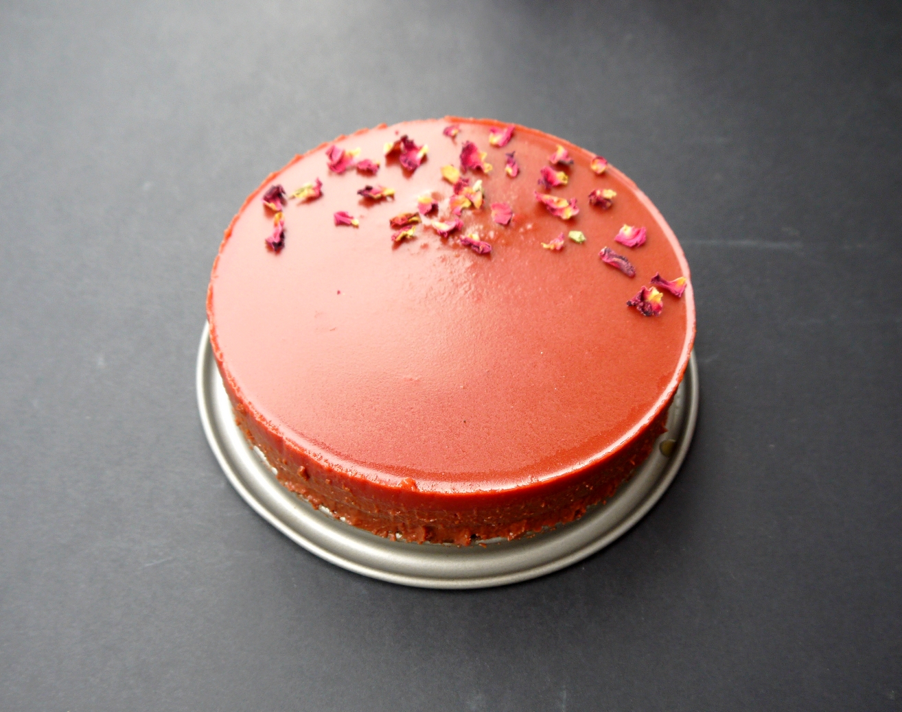Legtöbbször valamelyik alkotó elemével díszítem a tortát, fagyasztott eper esetében, ez sajnos nem lehetséges. A nyári zamatát szerencsére megőrzi, de a kiolvadt eper külalakja enyhén szólva is csúnya. Nem lenne túl látványos 🙂 , helyette pici, szárított rózsaszirmokkal szórtam meg a tortát.