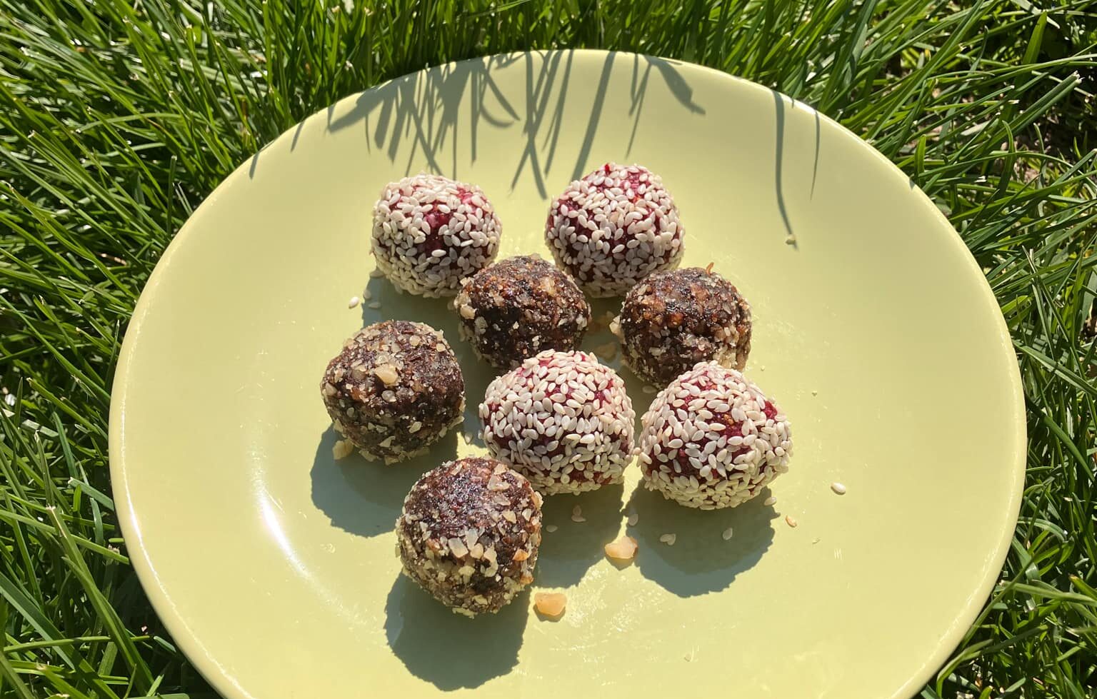 A hozzávalókat aprítógéppel felaprítjuk, és golyókat formázunk a masszából. A golyókat szezámmagba forgatjuk.
